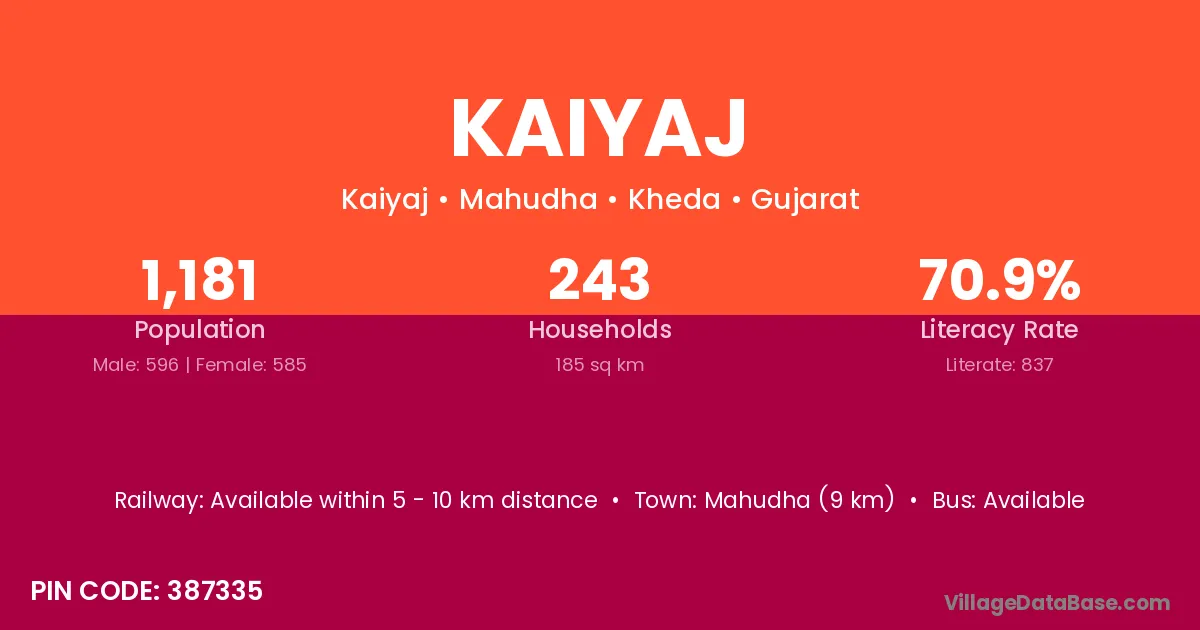 Mahudha (9 km) is the nearest town to Kaiyaj village for major economic activities and is located approximately 9 km away.