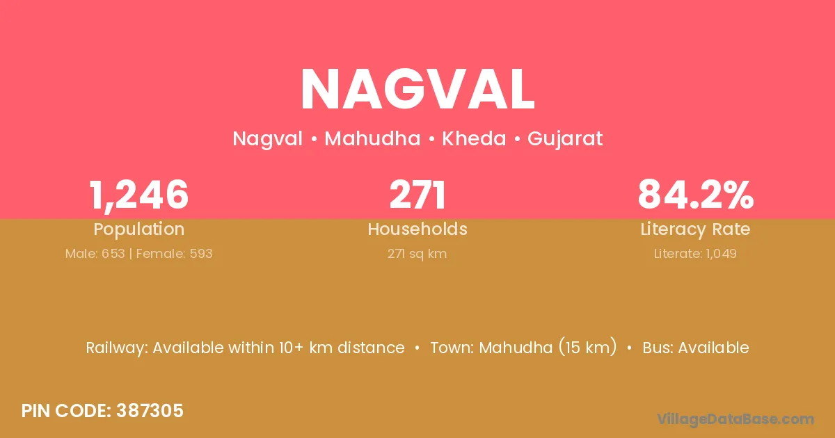 Mahudha (15 km) is the nearest town to Nagval village for major economic activities and is located approximately 15 km away.