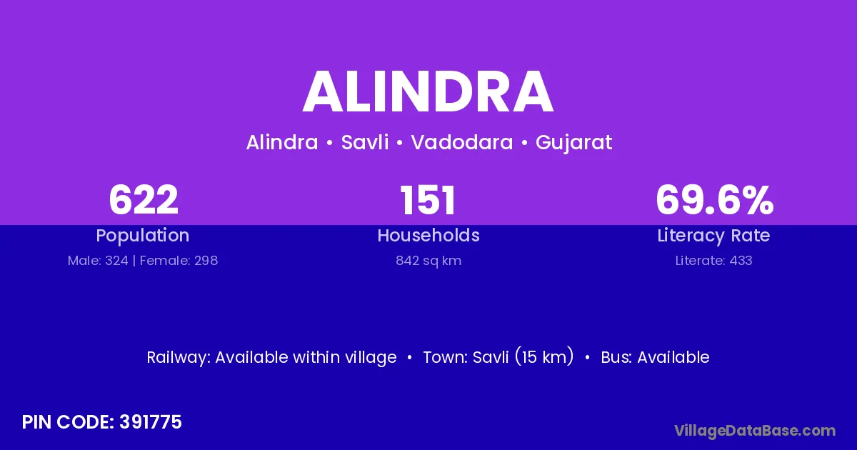 Nadiad (10 km) is the nearest town to Alindra village for major economic activities and is located approximately 10 km away.
