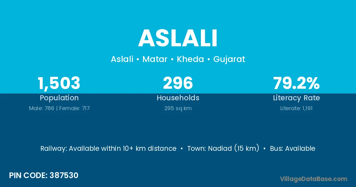 Nadiad (15 km) is the nearest town to Aslali village for major economic activities and is located approximately 15 km away.