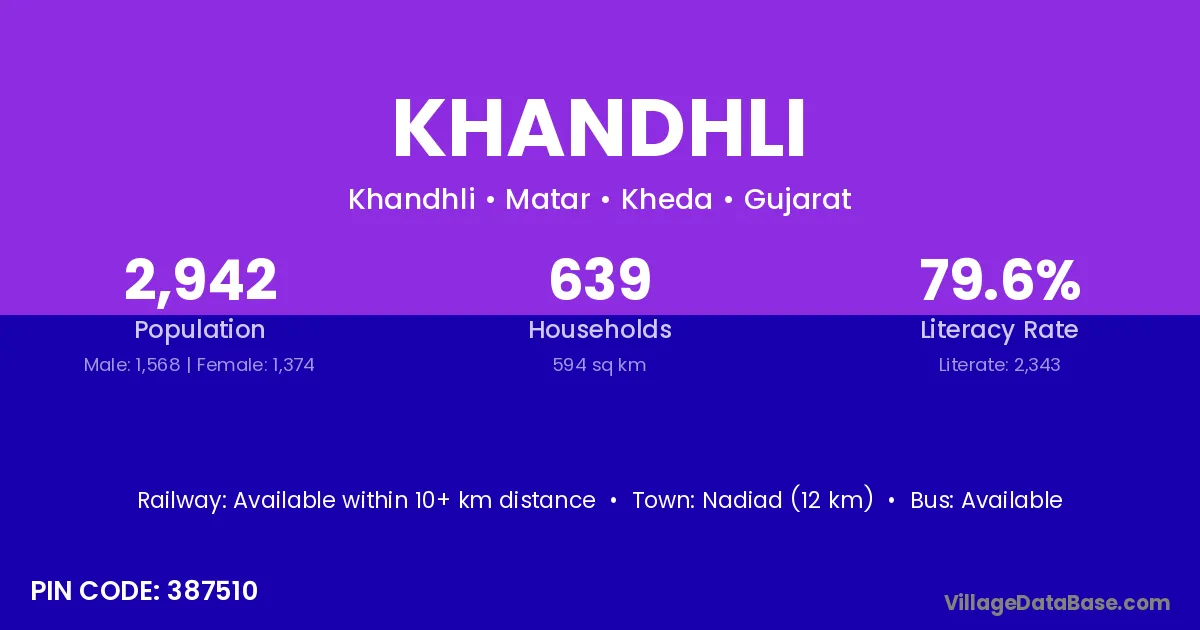 Nadiad (12 km) is the nearest town to Khandhli village for major economic activities and is located approximately 12 km away.