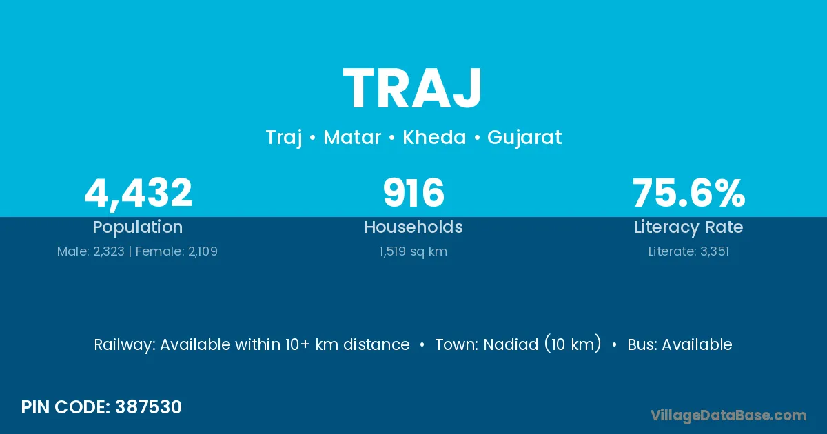 Nadiad (10 km) is the nearest town to Traj village for major economic activities and is located approximately 10 km away.