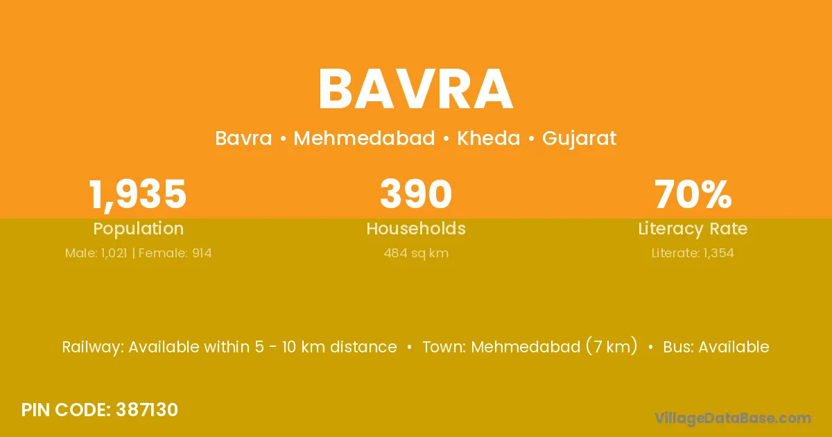 Mehmedabad (7 km) is the nearest town to Bavra village for major economic activities and is located approximately 7 km away.