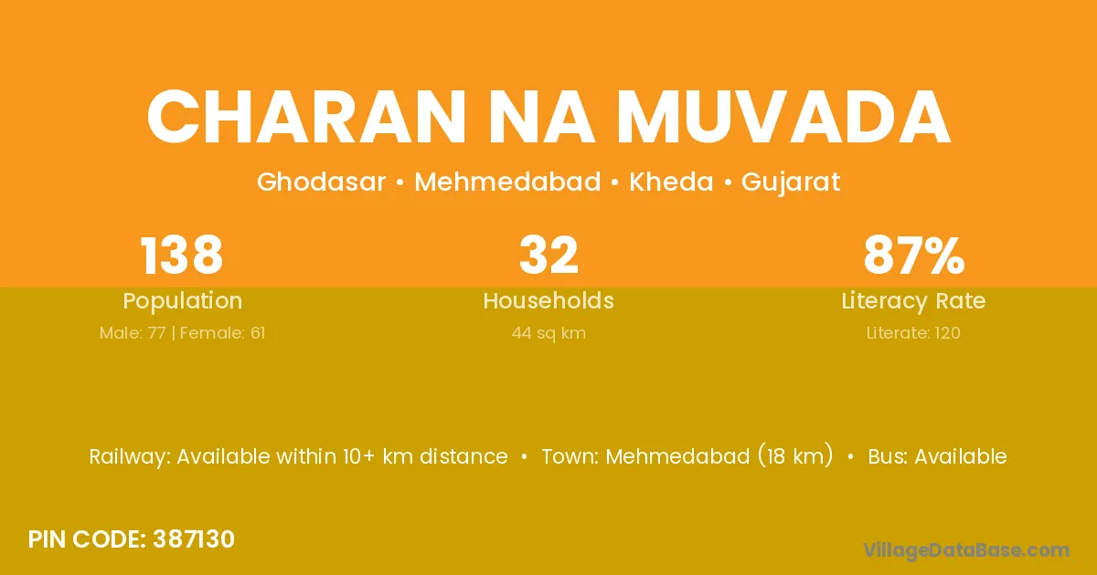Mehmedabad (18 km) is the nearest town to Charan Na Muvada village for major economic activities and is located approximately 18 km away.