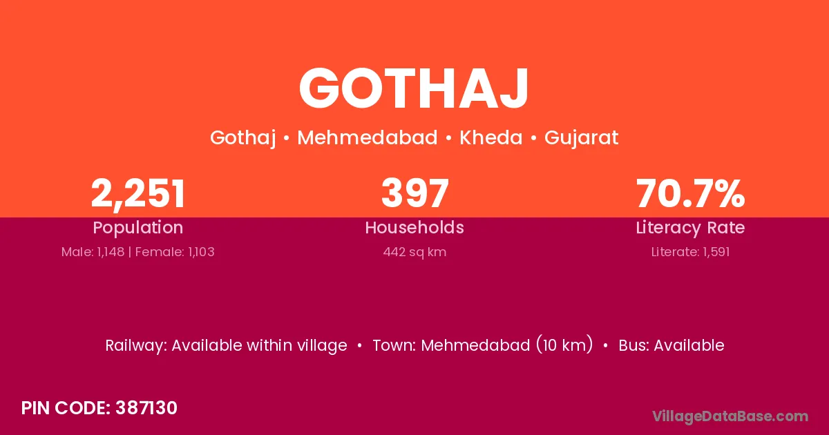 Mehmedabad (10 km) is the nearest town to Gothaj village for major economic activities and is located approximately 10 km away.