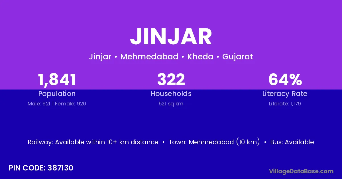 Mehmedabad (10 km) is the nearest town to Jinjar village for major economic activities and is located approximately 10 km away.