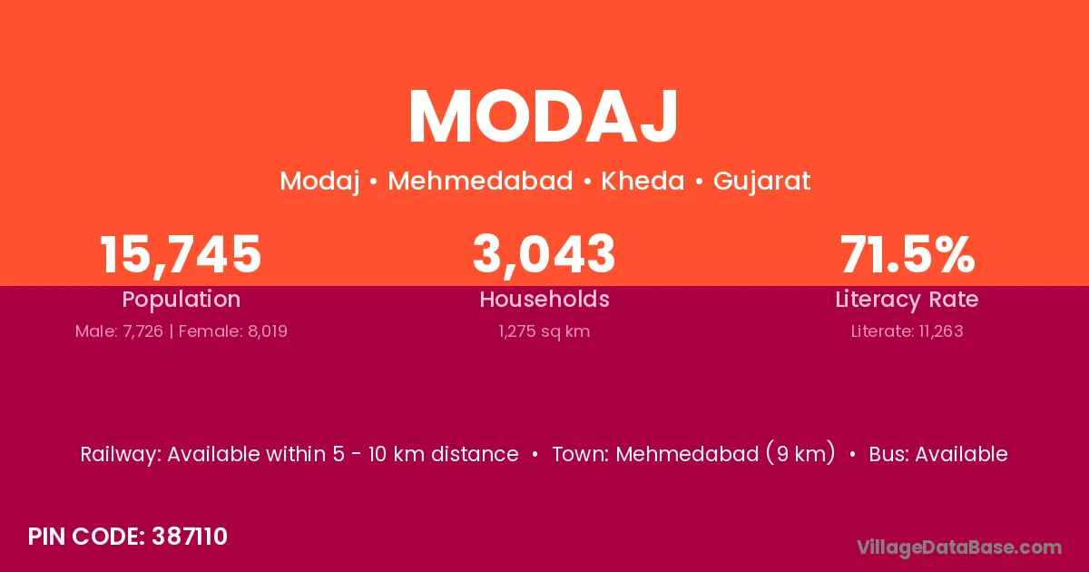 Mehmedabad (9 km) is the nearest town to Modaj village for major economic activities and is located approximately 9 km away.
