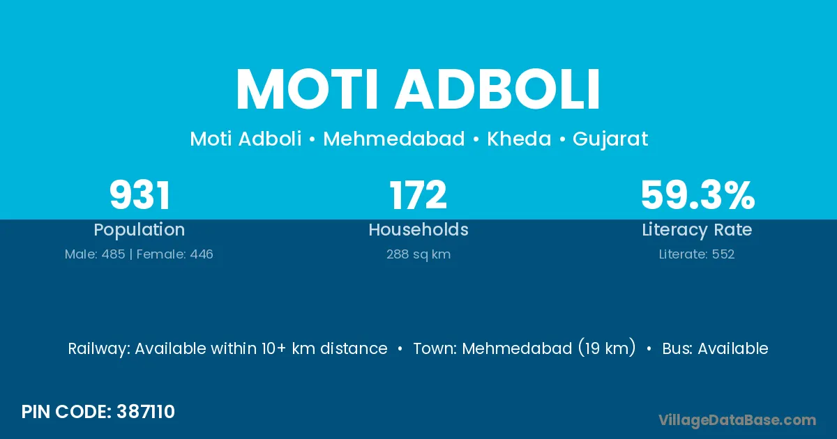 Mehmedabad (19 km) is the nearest town to Moti Adboli village for major economic activities and is located approximately 19 km away.