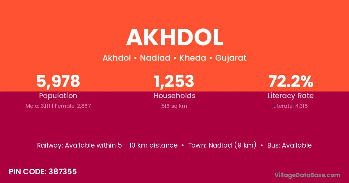 Nadiad (9 km) is the nearest town to Akhdol village for major economic activities and is located approximately 9 km away.
