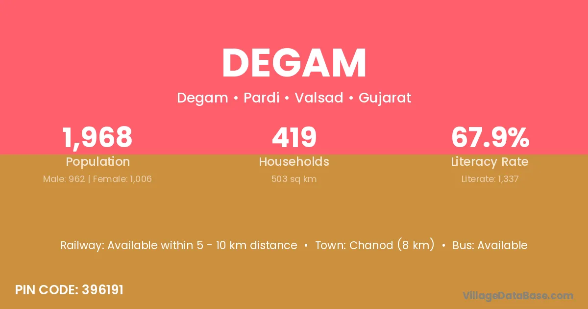 Nadiad (11 km) is the nearest town to Degam village for major economic activities and is located approximately 11 km away.