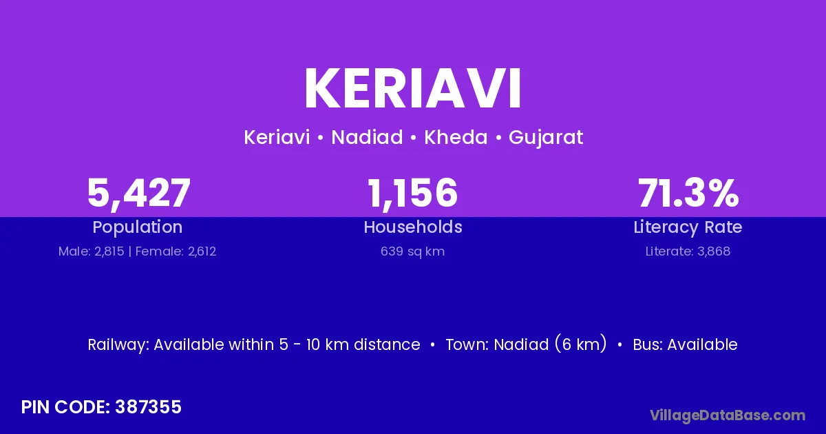 Nadiad (6 km) is the nearest town to Keriavi village for major economic activities and is located approximately 6 km away.