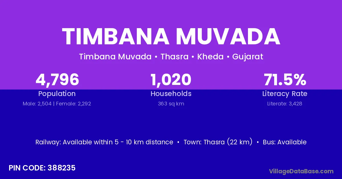 Thasra (22 km) is the nearest town to Timbana Muvada village for major economic activities and is located approximately 22 km away.