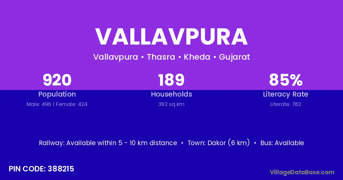 Dakor (6 km) is the nearest town to Vallavpura village for major economic activities and is located approximately 6 km away.