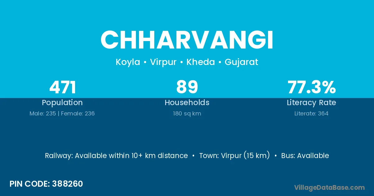 Virpur (15 km) is the nearest town to Chharvangi village for major economic activities and is located approximately 15 km away.