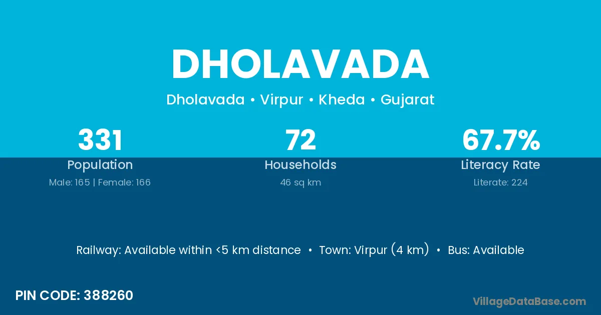Virpur (4 km) is the nearest town to Dholavada village for major economic activities and is located approximately 4 km away.