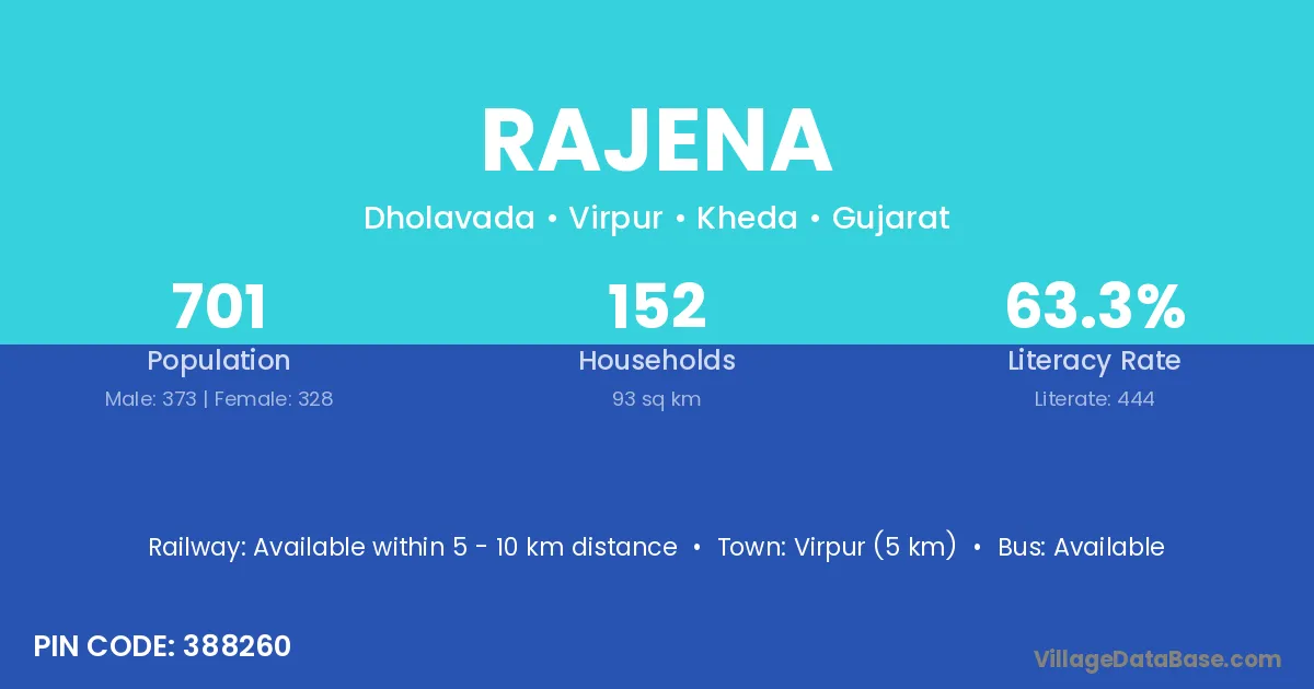Virpur (5 km) is the nearest town to Rajena village for major economic activities and is located approximately 5 km away.