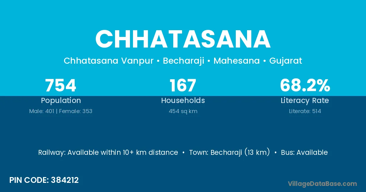 Becharaji (13 km) is the nearest town to Chhatasana village for major economic activities and is located approximately 13 km away.