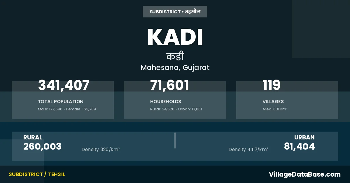 According to the 2011 census The total area of Kadi Taluka is 831 km², with a population of 341407 people. The population density is 411 inhabitants per square kilometre, and there are approximately 71601 houses in the sub district.