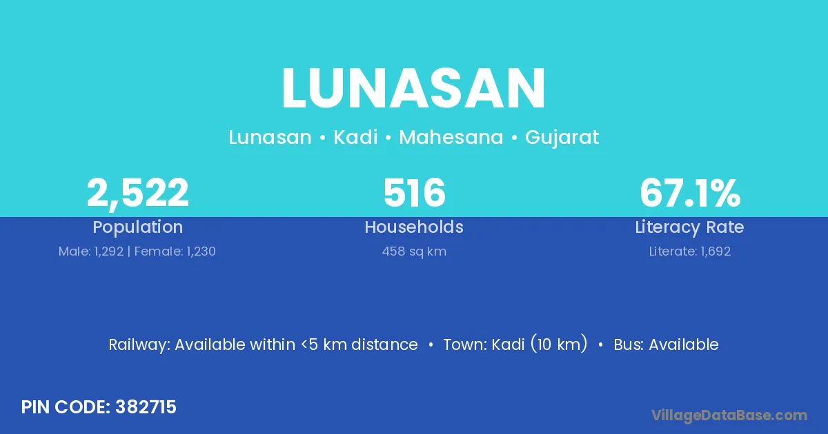 According to Census 2011 information, the village code of Lunasan village is 382715.