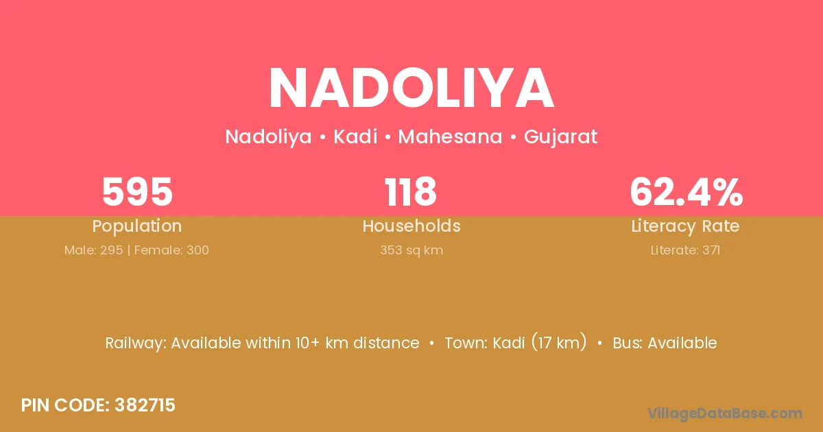 Kadi (17 km) is the nearest town to Nadoliya village for major economic activities and is located approximately 17 km away.