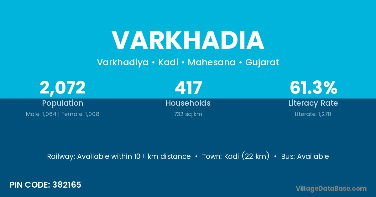 Kadi (22 km) is the nearest town to Varkhadia village for major economic activities and is located approximately 22 km away.