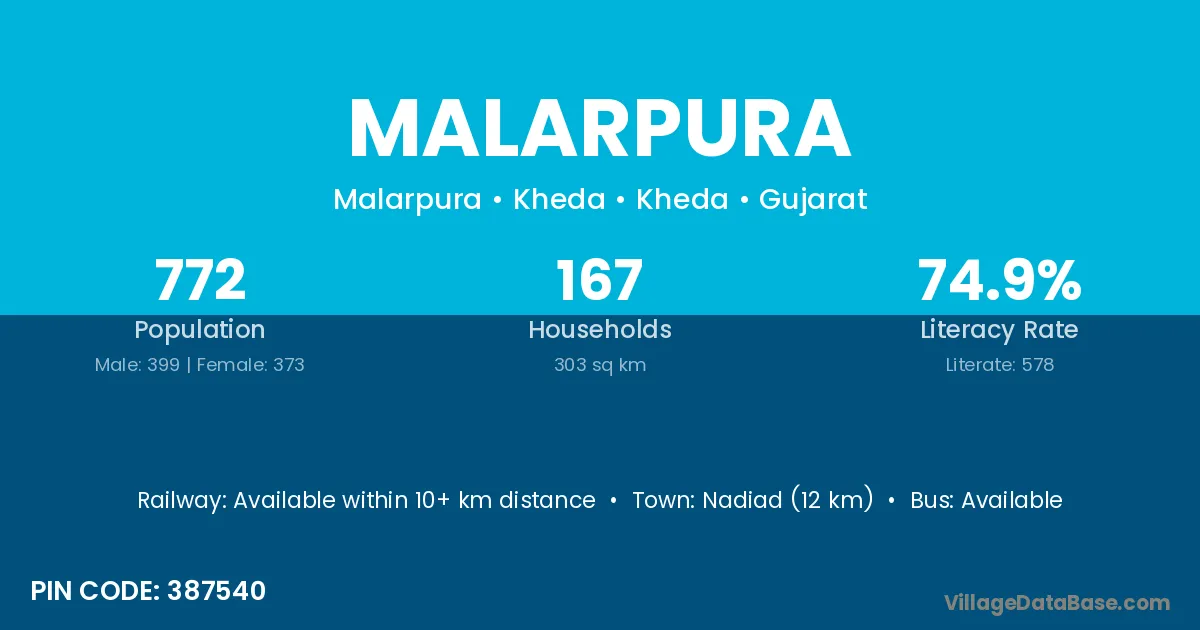 Kheralu (6 km) is the nearest town to Malarpura village for major economic activities and is located approximately 6 km away.