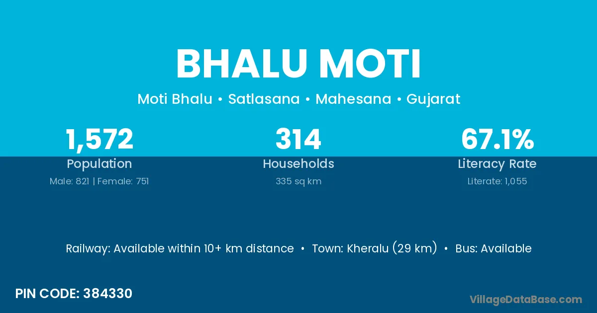 Kheralu (29 km) is the nearest town to Bhalu Moti village for major economic activities and is located approximately 29 km away.