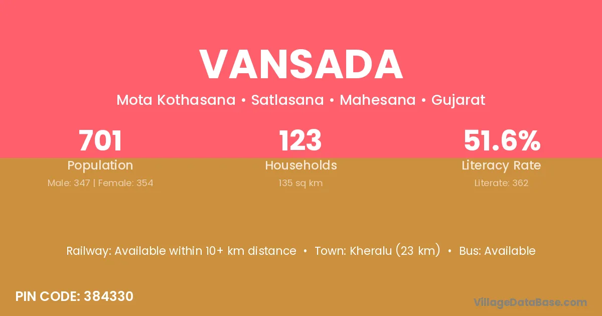 Kheralu (23 km) is the nearest town to Vansada village for major economic activities and is located approximately 23 km away.