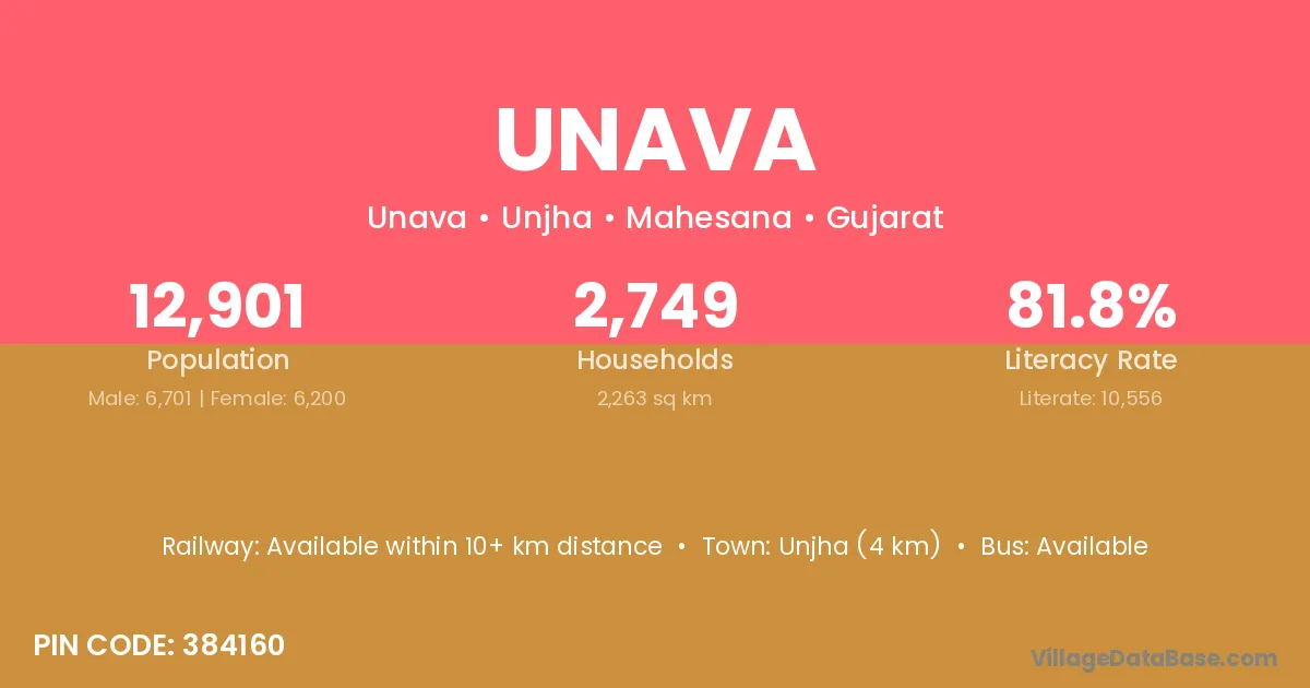 Unjha (4 km) is the nearest town to Unava village for major economic activities and is located approximately 4 km away.