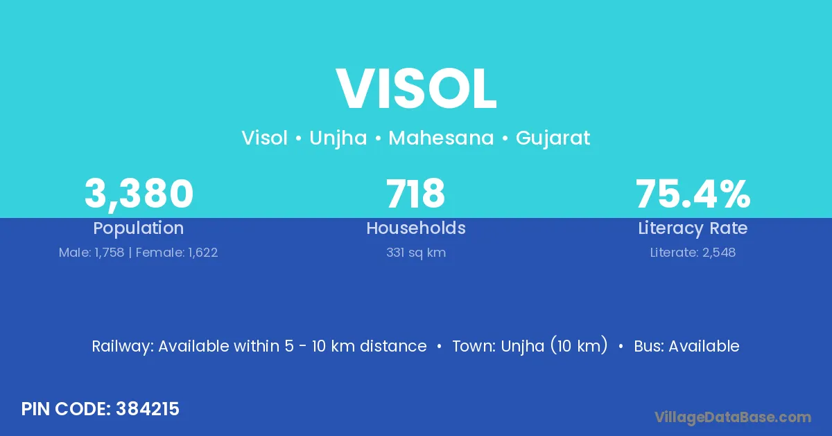 Unjha (10 km) is the nearest town to Visol village for major economic activities and is located approximately 10 km away.