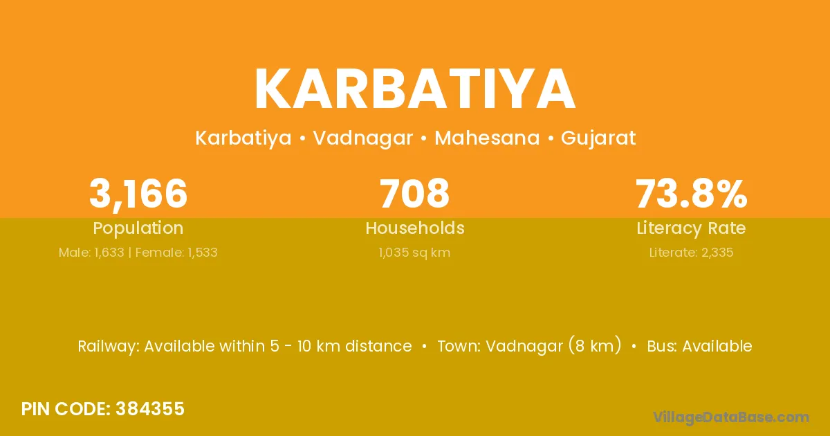 Vadnagar (8 km) is the nearest town to Karbatiya village for major economic activities and is located approximately 8 km away.
