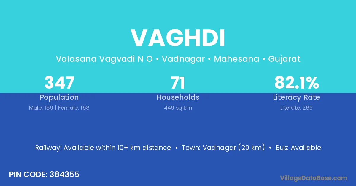 Vadnagar (20 km) is the nearest town to Vaghdi village for major economic activities and is located approximately 20 km away.