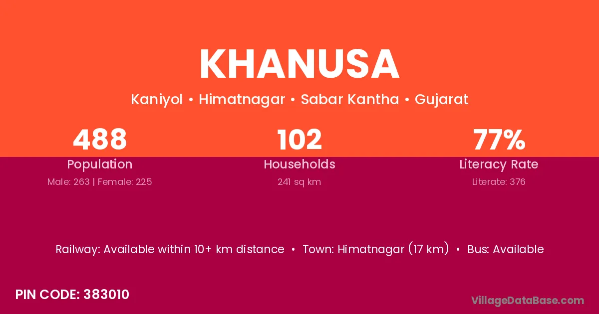 According to Census 2011 information, the village code of Khanusa village is 382850.