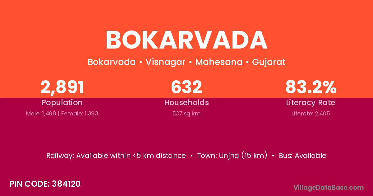Unjha (15 km) is the nearest town to Bokarvada village for major economic activities and is located approximately 15 km away.