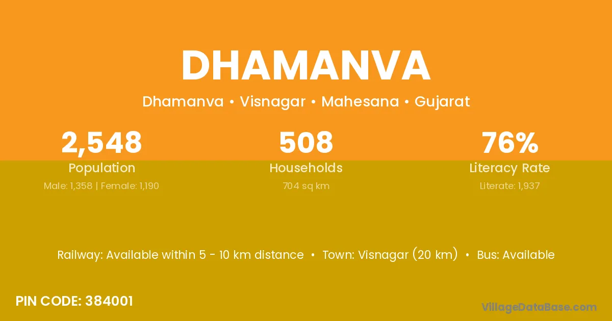 Visnagar (20 km) is the nearest town to Dhamanva village for major economic activities and is located approximately 20 km away.