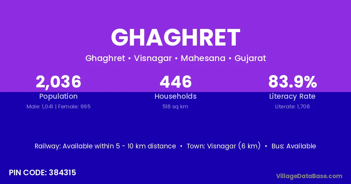 Visnagar (6 km) is the nearest town to Ghaghret village for major economic activities and is located approximately 6 km away.