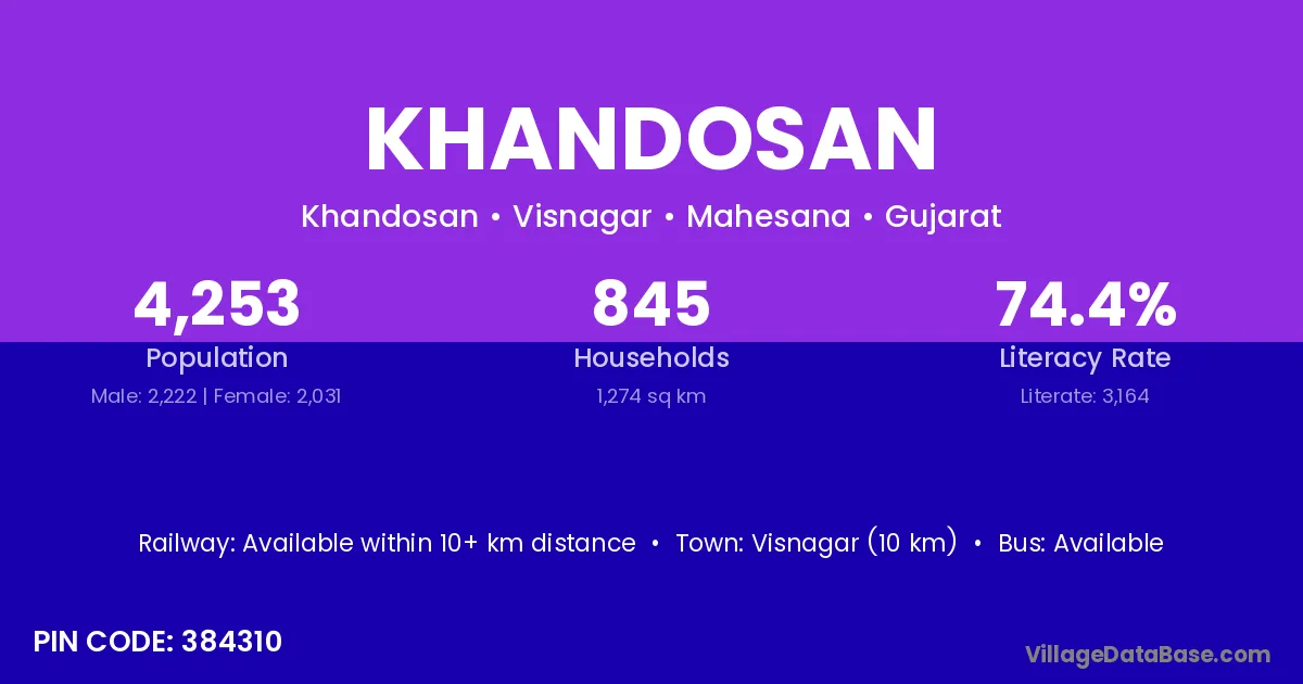 Visnagar (10 km) is the nearest town to Khandosan village for major economic activities and is located approximately 10 km away.