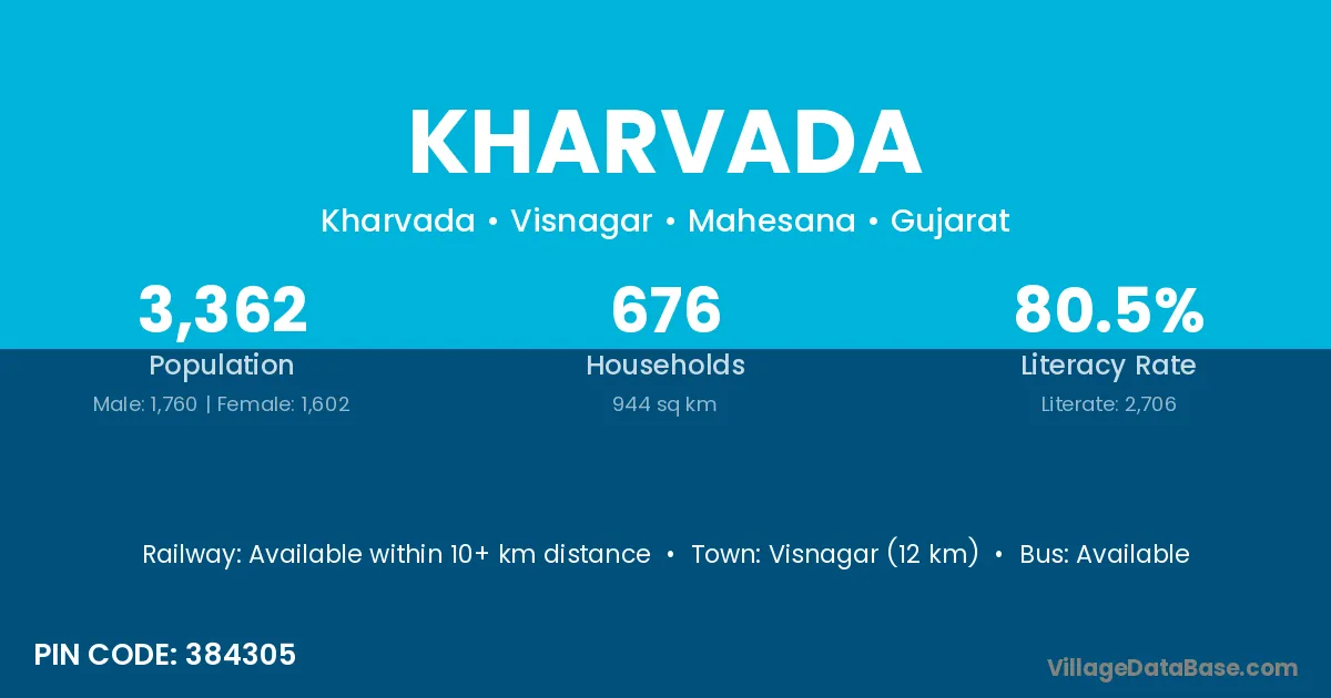 Visnagar (12 km) is the nearest town to Kharvada village for major economic activities and is located approximately 12 km away.