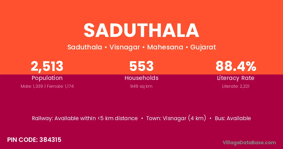 Visnagar (4 km) is the nearest town to Saduthala village for major economic activities and is located approximately 4 km away.