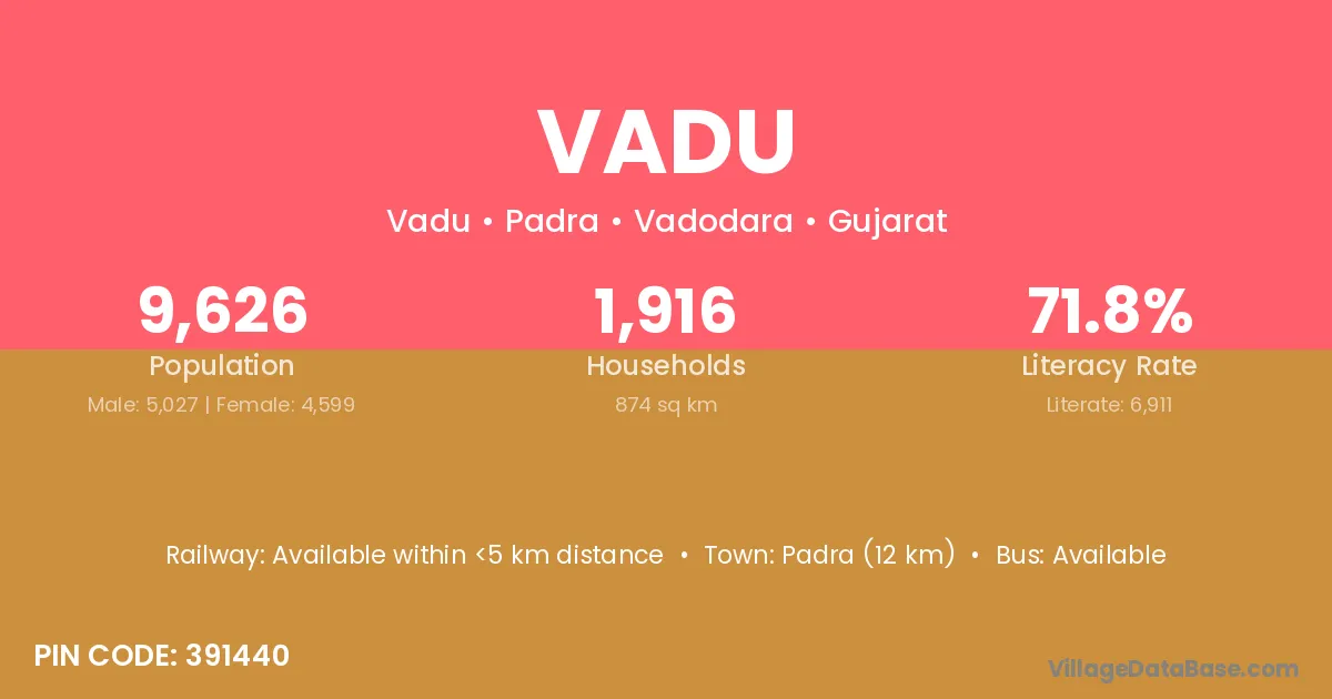 Visnagar (12 km) is the nearest town to Vadu village for major economic activities and is located approximately 12 km away.