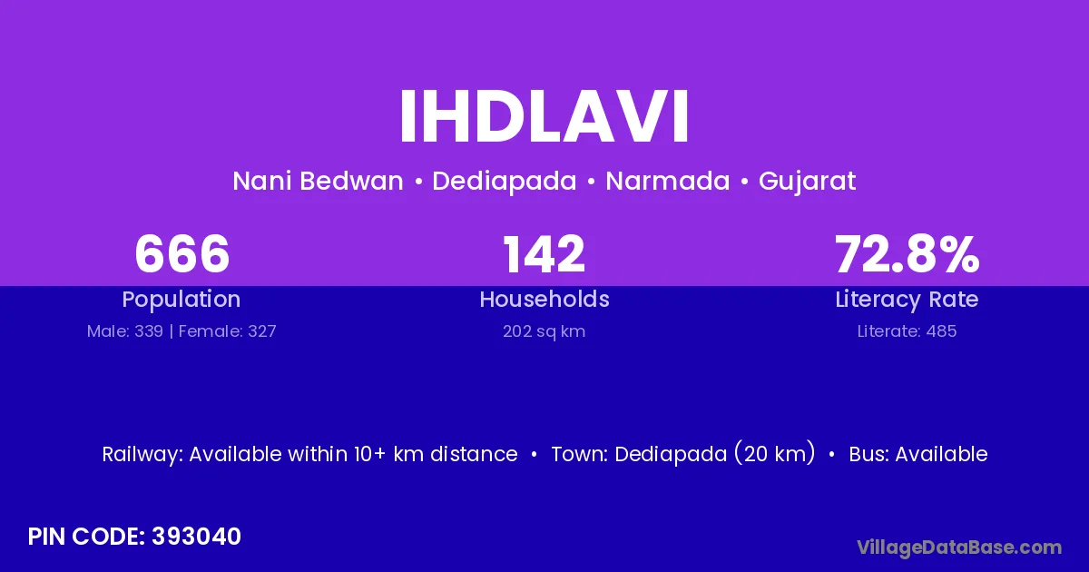 Dediapada (20 km) is the nearest town to Ihdlavi village for major economic activities and is located approximately 20 km away.