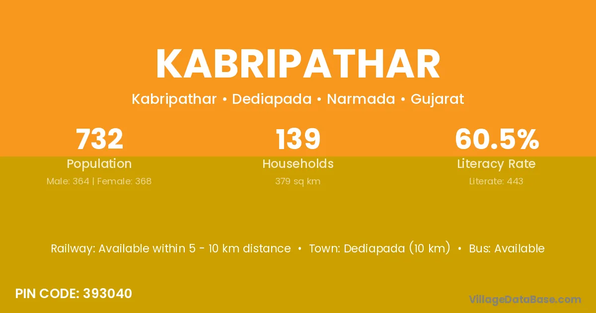 Dediapada (10 km) is the nearest town to Kabripathar village for major economic activities and is located approximately 10 km away.