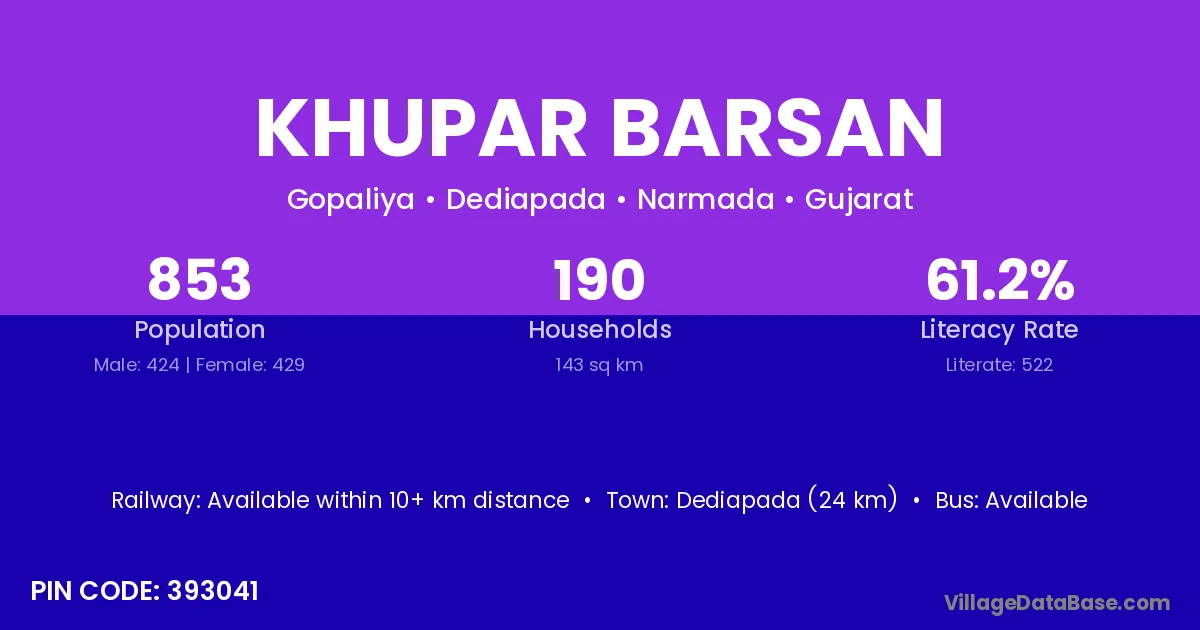 Dediapada (24 km) is the nearest town to Khupar Barsan village for major economic activities and is located approximately 24 km away.