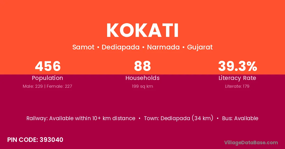 Dediapada (34 km) is the nearest town to Kokati village for major economic activities and is located approximately 34 km away.