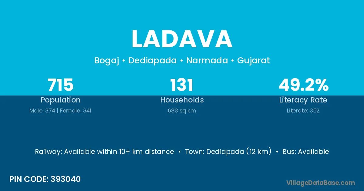 Dediapada (12 km) is the nearest town to Ladava village for major economic activities and is located approximately 12 km away.