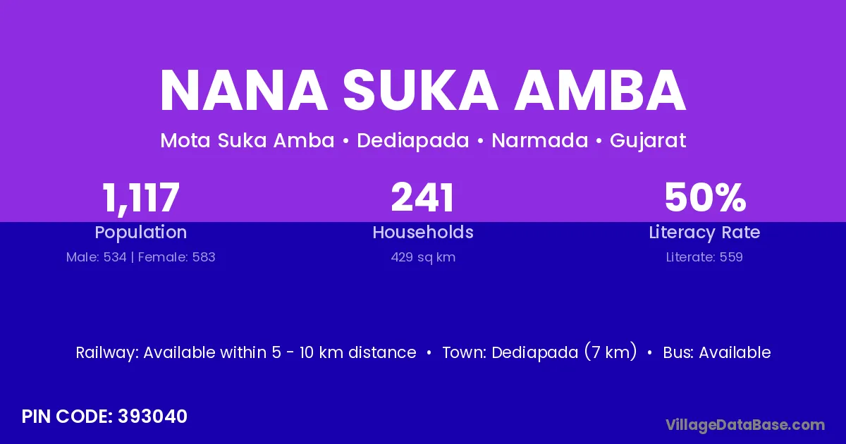 Dediapada (7 km) is the nearest town to Nana Suka Amba village for major economic activities and is located approximately 7 km away.