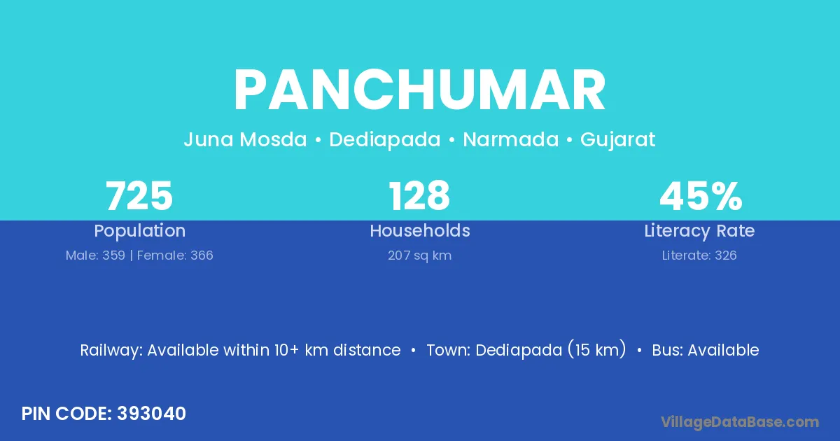 Dediapada (15 km) is the nearest town to Panchumar village for major economic activities and is located approximately 15 km away.