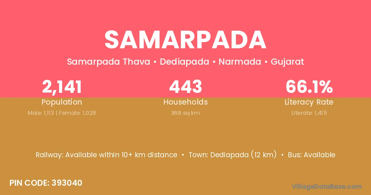 Dediapada (12 km) is the nearest town to Samarpada village for major economic activities and is located approximately 12 km away.