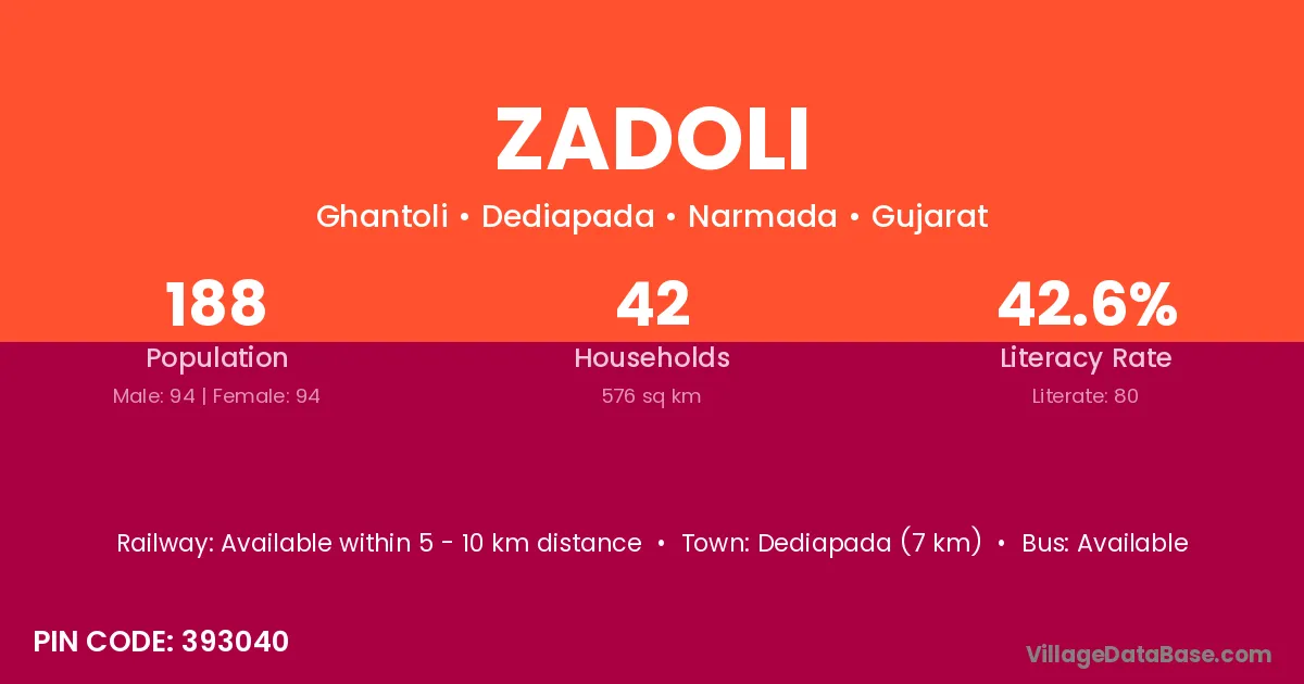 Dediapada (7 km) is the nearest town to Zadoli village for major economic activities and is located approximately 7 km away.