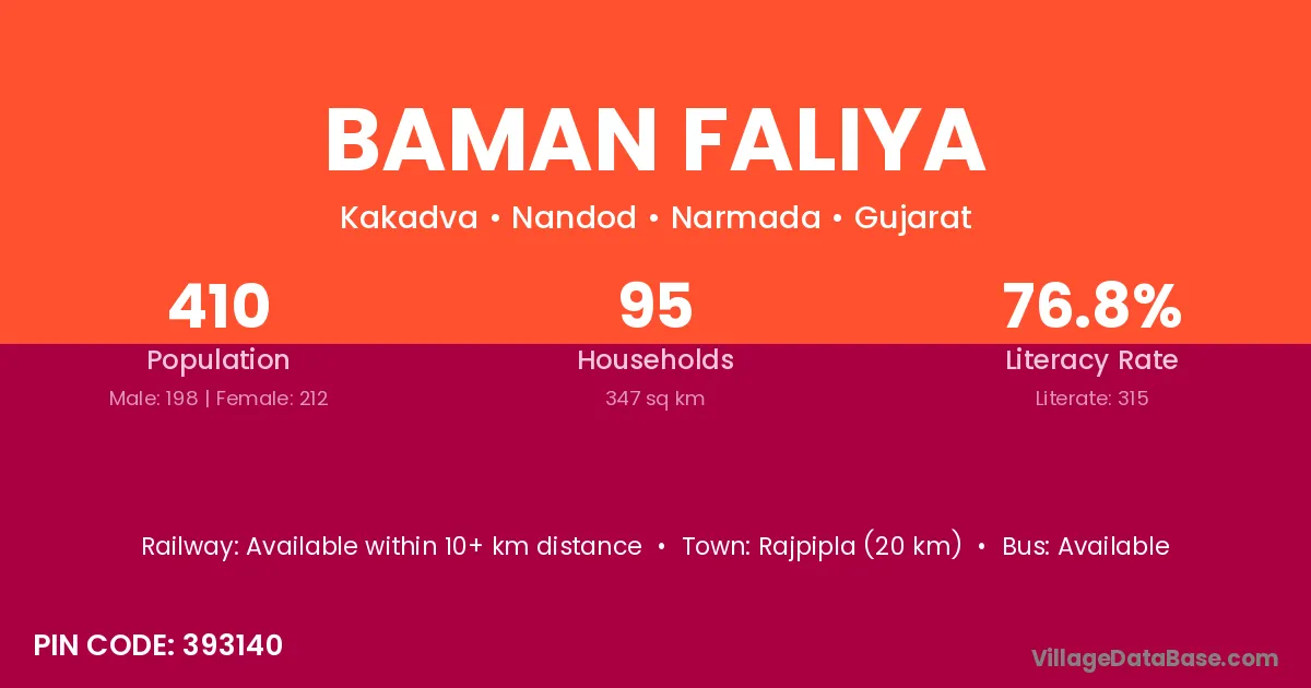 Rajpipla (20 km) is the nearest town to Baman Faliya village for major economic activities and is located approximately 20 km away.